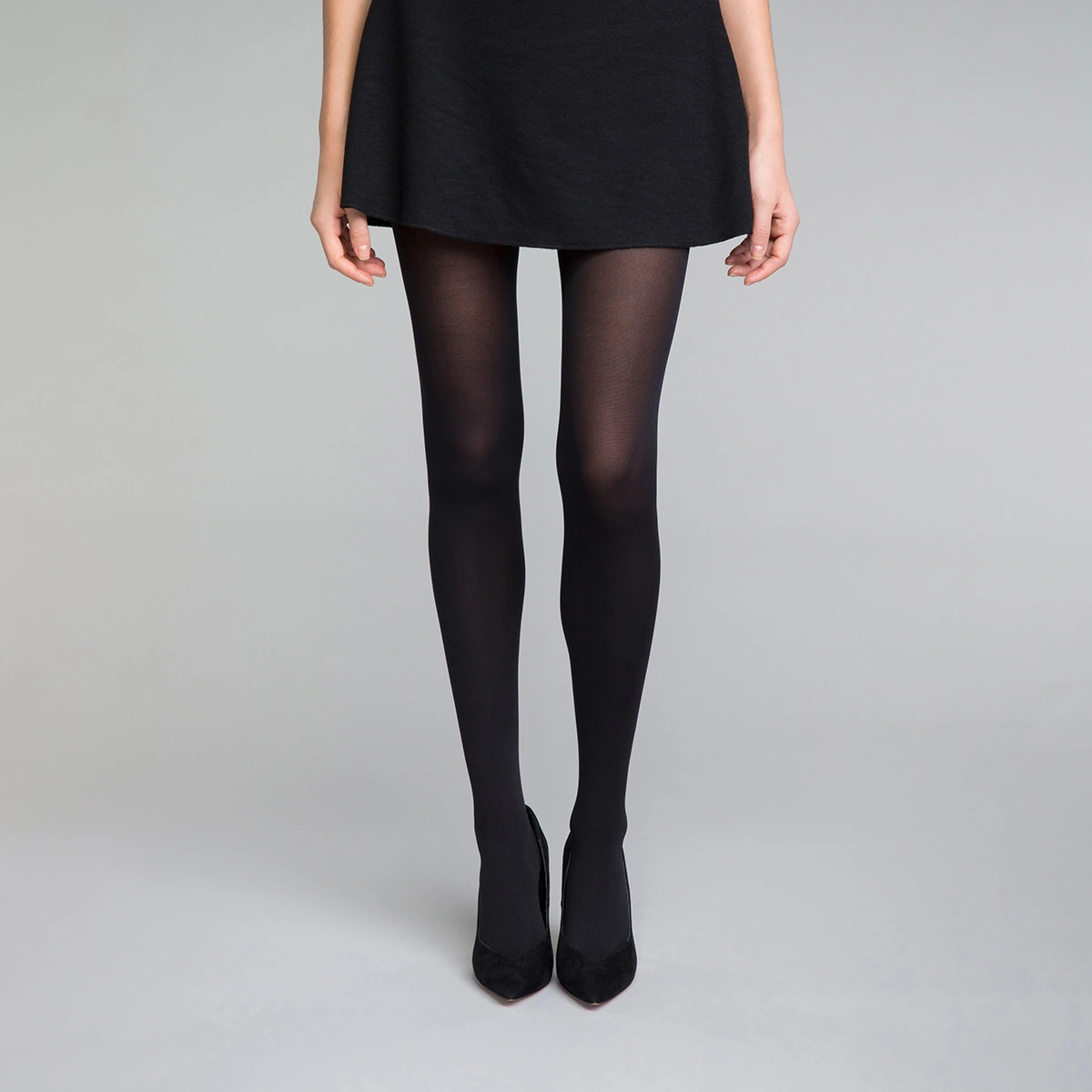 Portez les collants noirs opaques avec une robe ou une jupe noire et twistez votre tenue avec une touche de couleur.